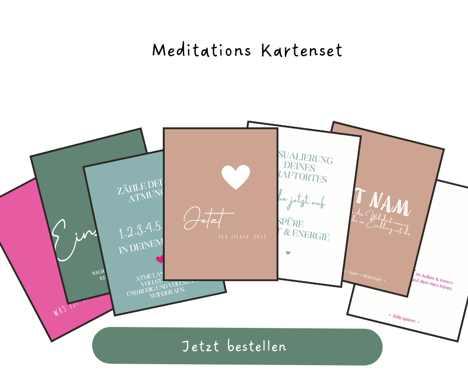 Das Meditationskartenset lädt dich ein, kurze Momente der Ruhe ganz einfach in deinen Alltag zu holen. Jede Karte schenkt dir eine sanfte Inspiration, eine kleine Übung oder einen achtsamen Impuls, der dich dabei unterstützt, bei dir selbst anzukommen und inneren Frieden zu finden.